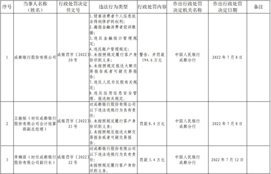 中国经济网北京7月15日讯 中国人民银行成都分行网站今日公布的行政处罚信息公示表(成银罚字〔2022〕20号、21号、22号)显示,成都银行股份有限公司存在以下8宗违法违规行为:侵害消费者个人信息依法得到保护的权利;漏报金融消费者投诉数据;违反金融统计管理规定;违反账户管理规定;未按照规定履行客户身份识别义务;未按照规定报送大额交易报告或者可疑交易报告;违反人民币反假有关规定;违反信用信息安全管理、报送相关规定中国人民银行成都分行对其警告,并罚款194.6万元。