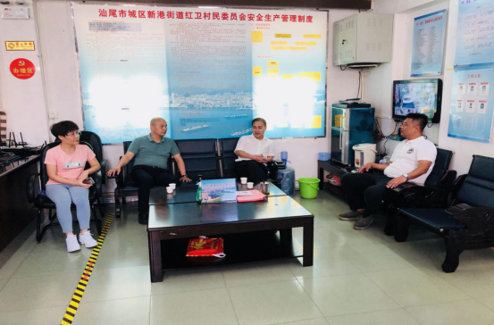 图为蔡振钦局长、彭伟彬副局长与红卫渔业村村支书交流座谈