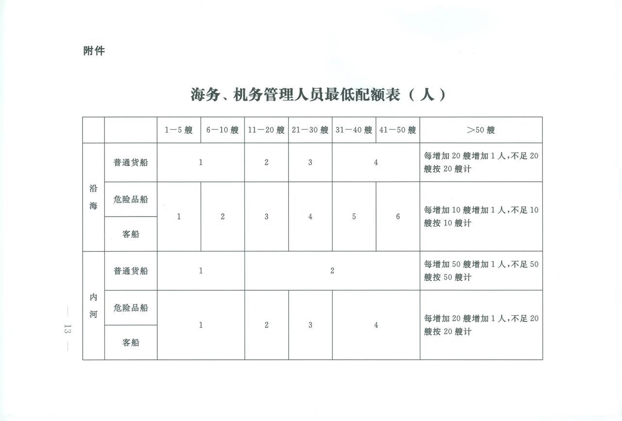 (一)船舶管理业务经营者应当至少配备海务、机务管理人员各1人,配备的具体数量应当符合附件规定的要求;