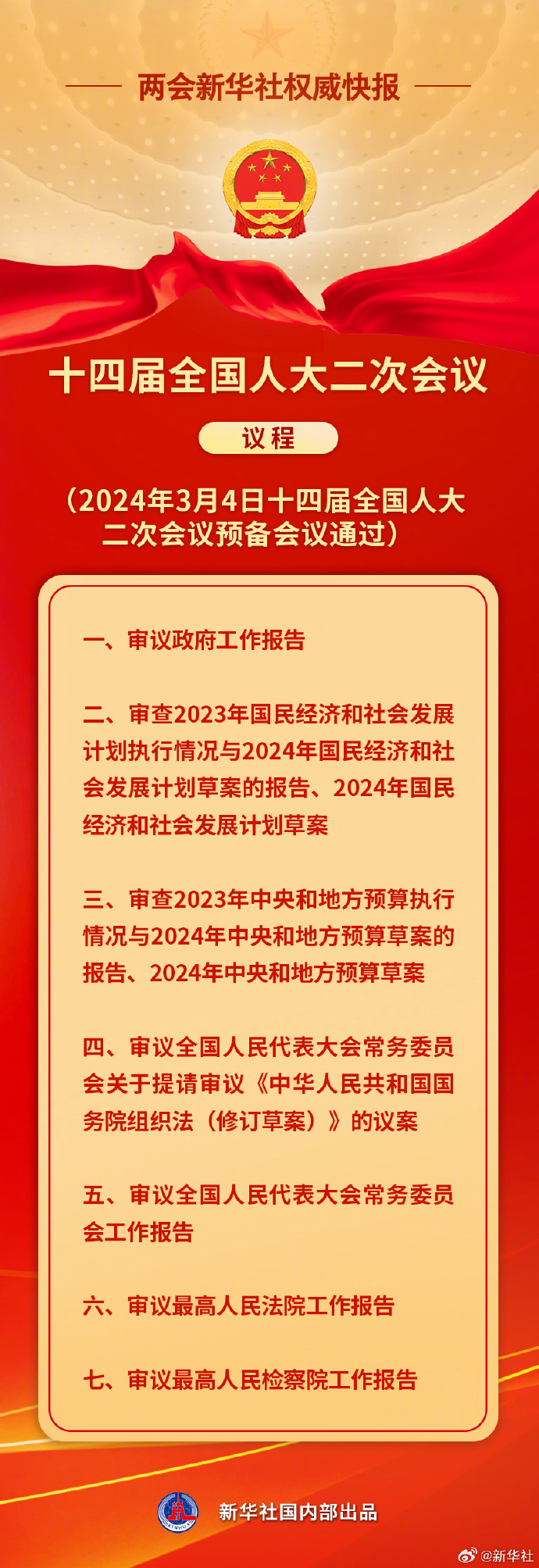 两会新华社权威快报丨十四届全国人大二次会议议程抢鲜看