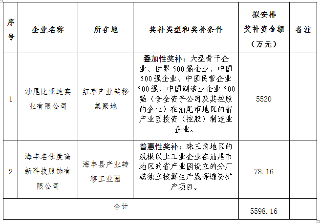 根据《广东省工业和信息化厅关于开展2018年度省产业共建财政扶持资金申报评审工作的通知》(粤工信园区函〔2018〕81号)、电影天堂 办对省工信厅(粤工信园区函﹝2018﹞81号)拟办意见以及《汕尾市经济和信息化局关于开展2018年度珠三角与粤东西北产业共建省级财政扶持资金申报工作的通知》(汕经信﹝2018﹞207号)等文件要求和规定,拟对汕尾比亚迪实业有限公司和海丰名仕度高新科技服饰有限公司符合政策条件的企业安排奖补资金合计5598.16万元(详见附件)。现将资金安排计划予以公示,如有异议,请向市经济和信息化局(工业园区科)反映。