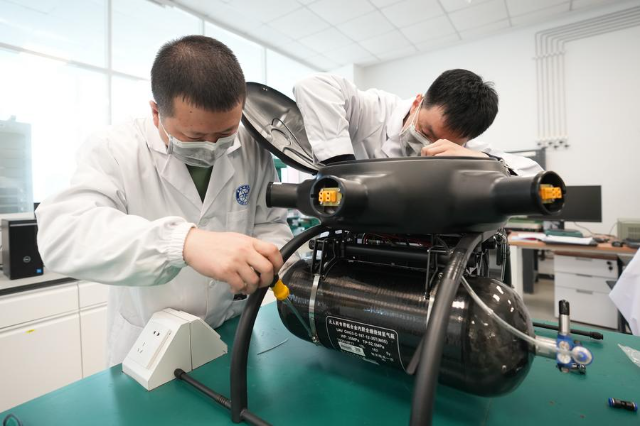 3月28日,科研人员在为无人机装配高比能氢混动力电源。新华社记者 潘昱龙 摄