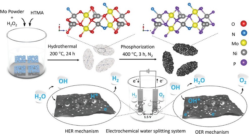 多孔N-NiMo3P的合成及电化学裂解海水过程图解。