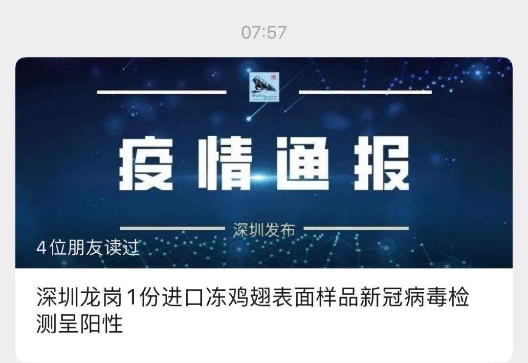 深圳市疫情防控指挥部办公室8月13日发布公告称,8月11日深圳市龙岗区对进口冷链食品排查检测,8月12日经省、市疾控中心复核,发现1份从巴西进口的冻鸡翅(注册号:SIF601;批号:7720051522)表面样品新冠病毒核酸检测结果呈阳性。