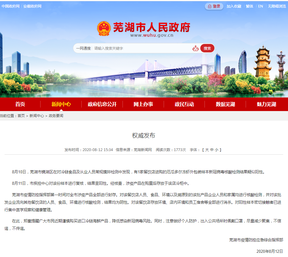 据安徽省芜湖市人民政府官网昨日(12日)通报,8月10日,芜湖市镜湖区在对冷链食品及从业人员常规摸排检测中发现,有1家餐饮店进口的厄瓜多尔冻虾外包装样本新冠病毒核酸检测结果疑似阳性。