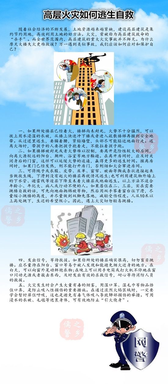 四、发出信号,等待救援。如果你所处的楼层确实很高,切勿盲目跳楼。应尽量待在阳台、窗口等易于被人发现和能避免烟火近身的地方。在白天,可以向窗外晃动鲜艳衣物;在晚上可以用手电筒或打火机不停地在窗口闪动光源或者敲击东西,及时发出有效的求救信号,耐心等待消防人员的救援。