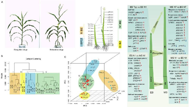 株高是最重要的株型性状之一,对玉米生长、光合作用、抗倒伏性和农机收割都有重要影响,是决定玉米产量的关键因素之一。株高主要取决于玉米茎秆节间数和节间长度,合理的株高才能促进玉米丰收高产。随着基因组学、生物信息学及预测模型的快速发展,目前已鉴定出一些玉米节间发育和株高相关的调控基因,然而对于玉米节间发育的系统研究和调控机制仍缺乏深入理解。