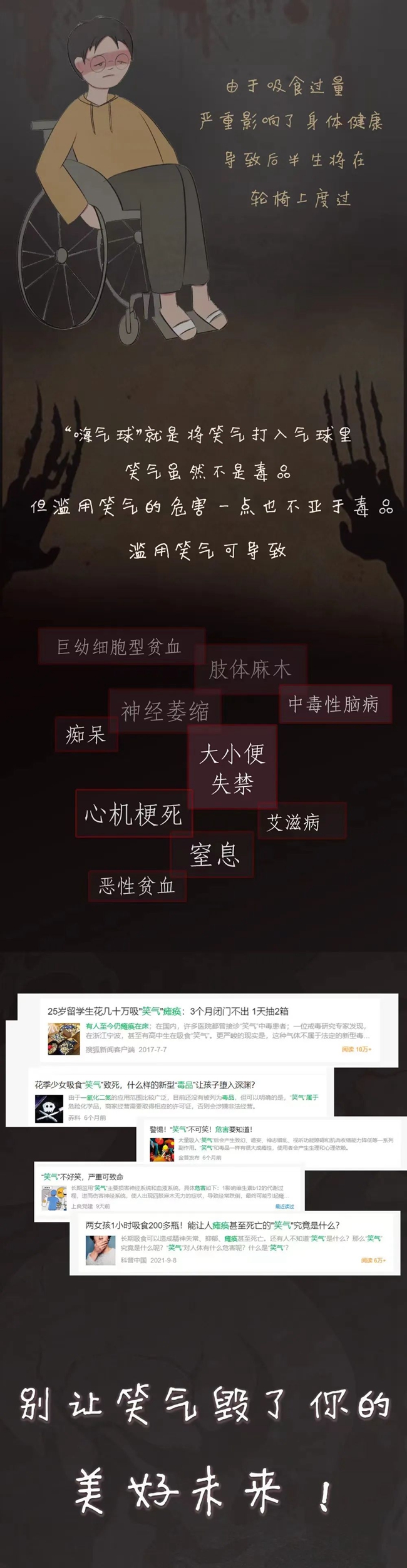 早年,一封名为《最终我坐着轮椅被推出了首都国际机场》广为流传,这几乎是不少人第一次听说“笑气”。信件的主角是一名学习毅力惊人的学霸,然而,在吸食一次“笑气”后,她对“笑气”的依赖越来越深,每天最大的快乐就是吸“笑气”,几个月花掉几十万。长时间吸食让她身体机能被破坏,抵抗力下降,神经控制系统功能丧失,以至于大小便失禁,生活无法自理,最终坐轮椅回国看病。
