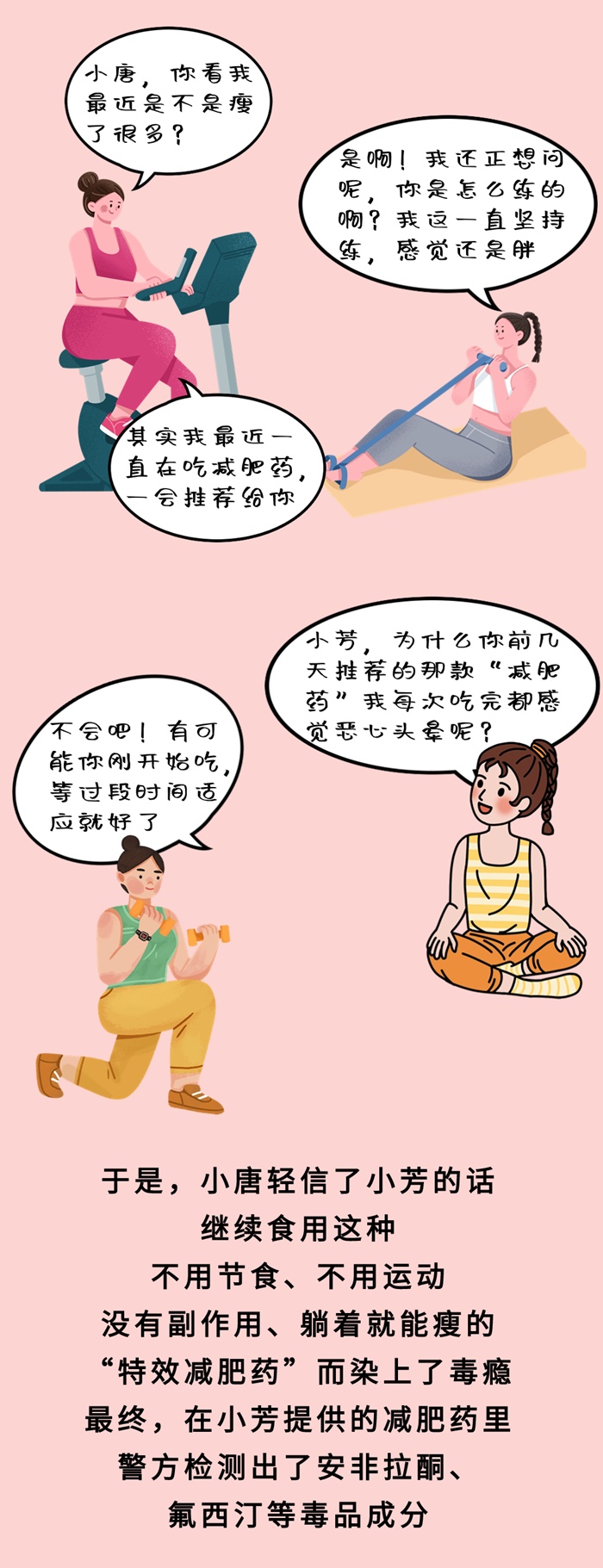 近年来,各地公安部门查获的不少所谓“网红减肥药”、“特效减肥药”,很多含有国家管制的精神药品,长期服用会损害中枢神经和心脑血管,并产生依赖性,长期食用与吸毒无异。无毒青春,健康成长,需要我们时刻保持警惕!