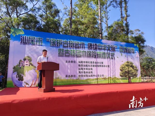 在活动仪式上,中华财险汕尾中支向海丰县林业局捐赠古树名木保险保障125万元,同时交付古树名木理赔款。古树名木保险保障责任涵盖因自然灾害或意外事故,导致投保的古树名木枯萎、倾倒、倾斜、主干分枝折损、蛀干、蛀枝等产生的财产损失以及施救费用。一旦古树出现问题,就可以马上启动保险理赔程序,请古树专家会诊,请专业第三方对古树进行治疗。
