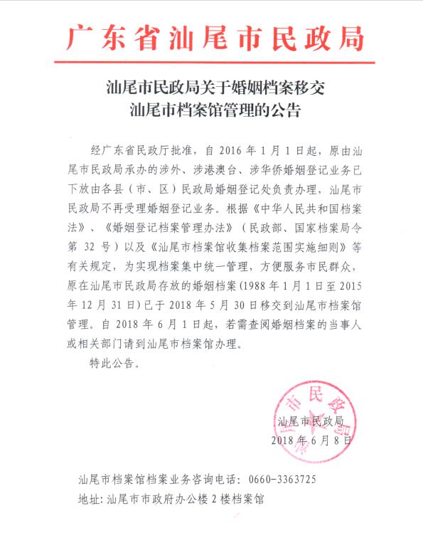 汕尾市民政局关于婚姻档案移交汕尾市档案馆管理的公告
