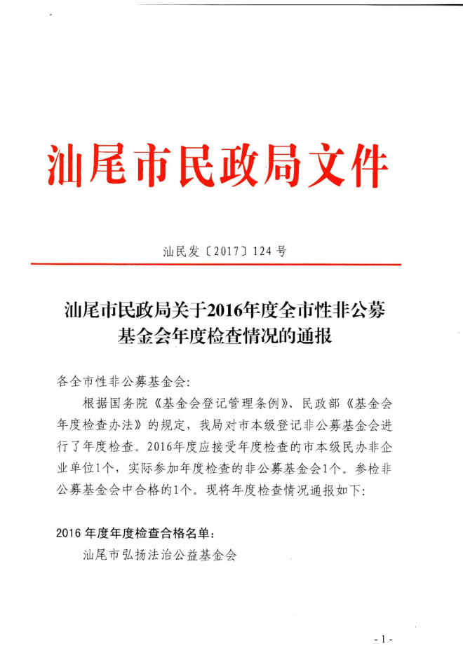 汕尾市民政局关于2016年度全市性非公募 基金会年度检查情况的通报