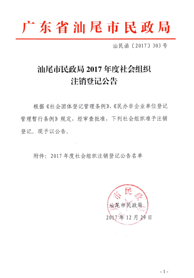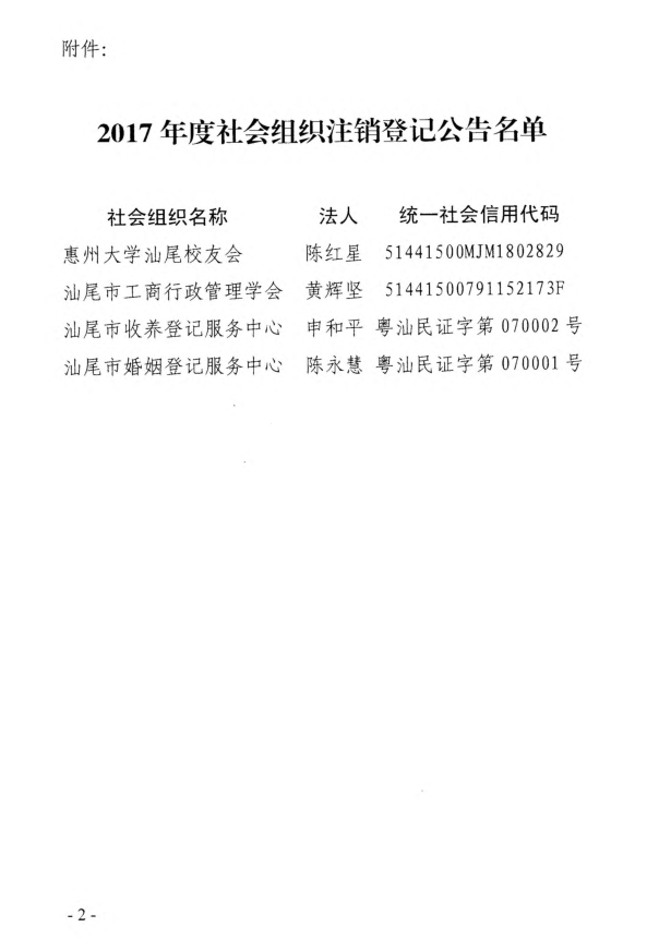 汕尾市民政局2017年度社会组织注销登记公告