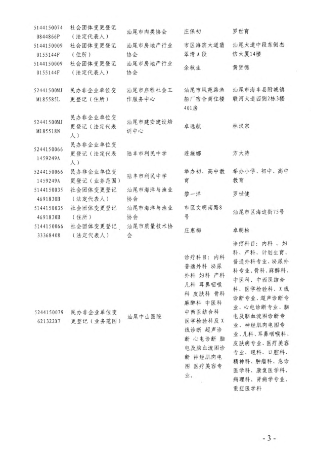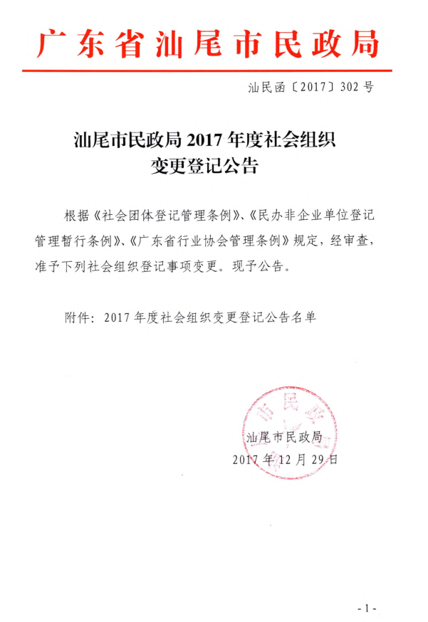 汕尾市民政局2017年度社会组织变更登记公告