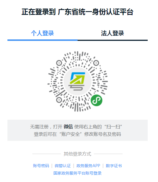 步骤三 进入“广东省统一身份认证平台”页面,点击“个人登录”或者“法人登录”,使用微信扫描“粤省事”二维码进行身份认证登录。