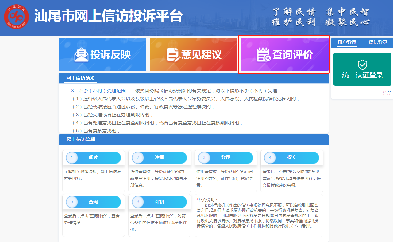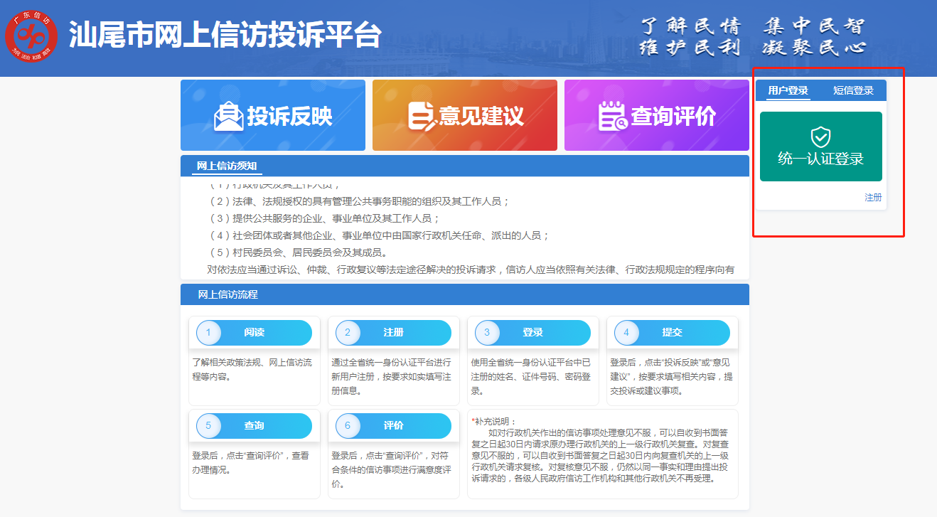 步骤二 进入“汕尾市网上信访投诉平台”后,请点击右侧“统一认证登录”。