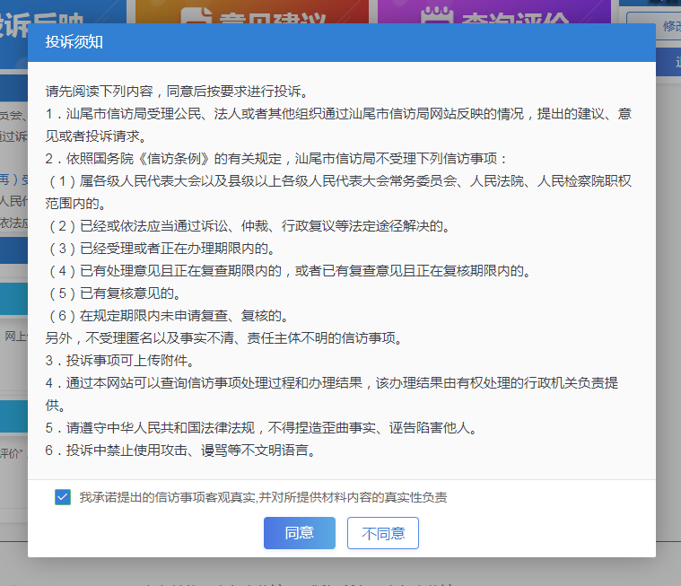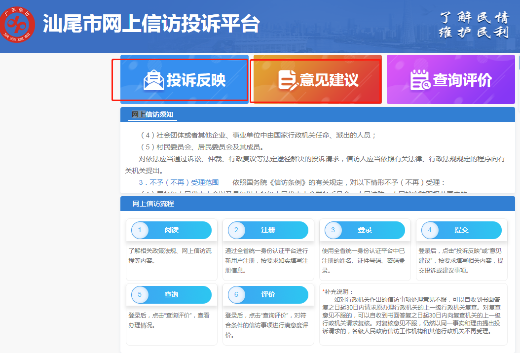 步骤四登录成功后,进入“汕尾市网上信访投诉平台”,进行网信信访投诉前,请认真阅读投诉平台电影天堂-电影天堂官方最快发布站“网上信访须知”。您可根据你的实际情况,选择你的诉求类型“投诉反映”或“意见建议”。