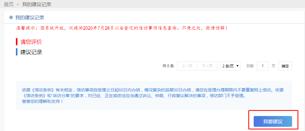 当您“确认”后,将进入“我的建议记录”页面,点击下方“我要建议”填写您的意见建议。