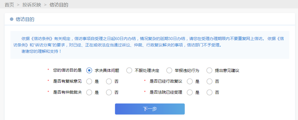 第一步进入“信访目的”页面,请认真阅读提醒内容后,选择您的“信访目的”,并按您的诉求实际情况选择是否有复查复核意见、是否有仲裁裁决、是否法院已受理、是否已行政复议等选项,这有利于工作人员对于您基本诉求的甄别,确保您的诉求能准确及时转交到有关部门。完成相关选项请点击“下一步”,进入“投诉请求”页面。