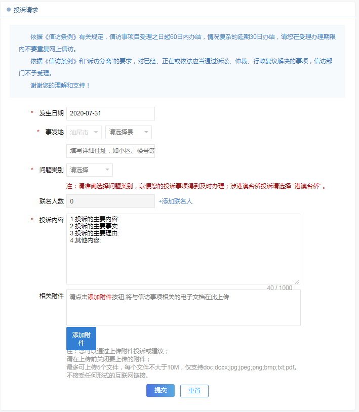第二步在“投诉请求”页面,请按要求选择“发生日期”“事发地”“问题类别”等选项,并在“投诉内容栏”填写您需要反映诉求的主要内容、主要事实、主要理由及需要反映的其他内容,此栏内容填写不超过800字,如您反映的具体内容比较多,或者有图片等依据材料,您可选择“添加附件”,将有关依据添加到附件栏,此处单个附件不得超过10M,最多只能添加5个附件。如还有其他人员与您共同反映问题,你可点击“添加联名人”添加相关人员个人信息。