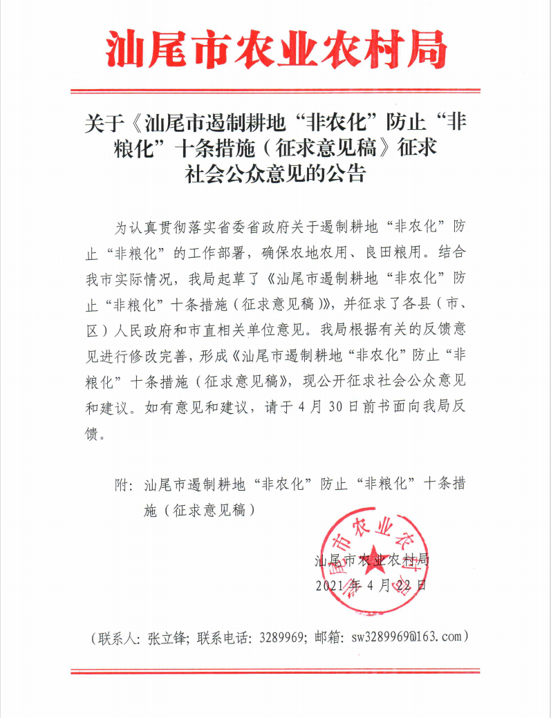 关于《汕尾市遏制耕地“非农化”防止“非粮化”十条措施(征求意见稿》征求社会公众意见的公告