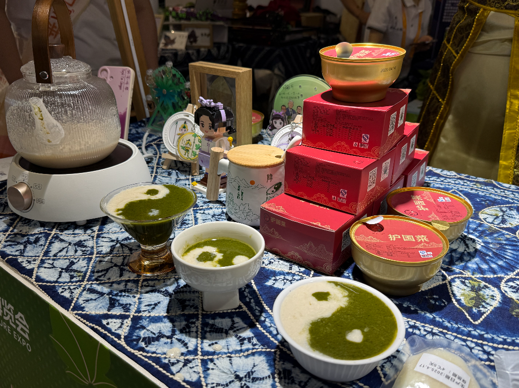 本次展会刚开幕,护国菜就吸引了众多与会代表关注,据汕尾青穗农业农场展位负责人刘小军介绍,“护国菜的制作极具匠心,需精选番薯嫩叶,经‘三洗三浸’去除杂质,以石磨研磨出翡翠色浆汁,配以北菇、火腿茸及高汤煨制,最终形成绿白相间的太极造型,既体现传统美学,又暗含阴阳调和之意。”