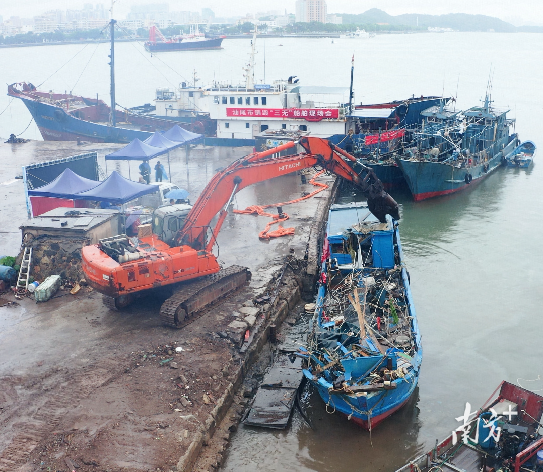 现场拆解号令响起后,工作人员利用大型挖掘机,将25艘涉渔“三无”船舶逐一拆解销毁,起到了“拆解一批、震慑一片”的良好效果。