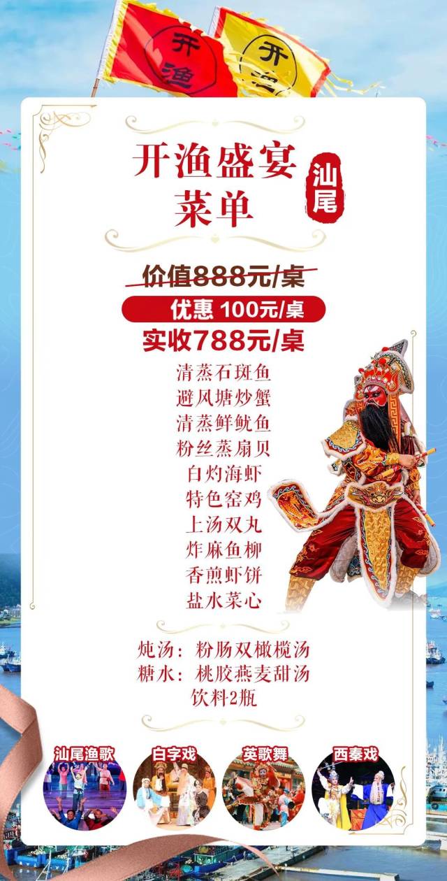 “汕尾味道”开渔盛宴计划在汕尾体育中心设宴200多桌,预计吸引超2000人参与。价值888元/桌,每桌优惠100元,优惠认购价:788元/桌。提供低价高品质的海鲜盛宴,让市民游客一站式尽享地道汕尾鲜味。