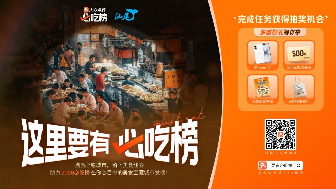 我们诚邀每位热爱汕尾的朋友,助力这座心中的宝藏美食城市荣耀登榜。即日起至2025年12月31日,只需打开大众点评App,搜索“汕尾要有必吃榜”,即可参与活动,点亮心愿城市汕尾!为你热爱的城市增加热度,留下地道美食线索,助力汕尾美食走向全国!