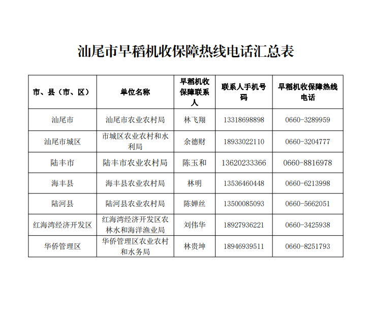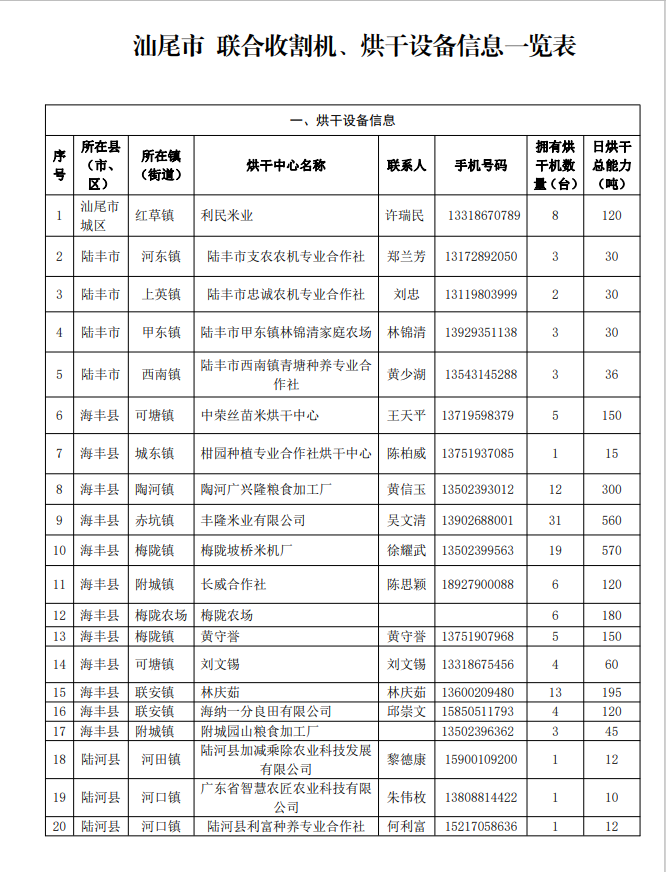 为确保早稻及时抢收,不误农时,颗粒归仓,现将《汕尾市早稻机收保障热线电话》和《汕尾市联合收割机、烘干设备信息一览表》公布如下,方便实现农机服务供需对接,及时解决早稻收获问题。