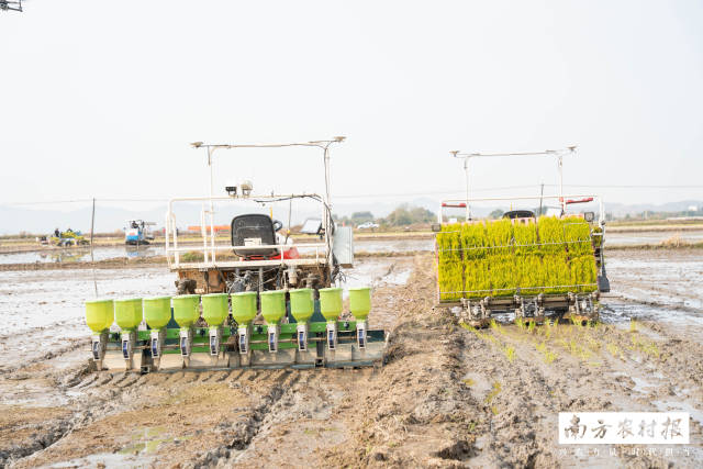 在广东丝苗米跨县集群产业园(汕尾市)内,新型无人驾驶插秧机、直播机正来回穿梭作业,抢抓春耕生产工作。