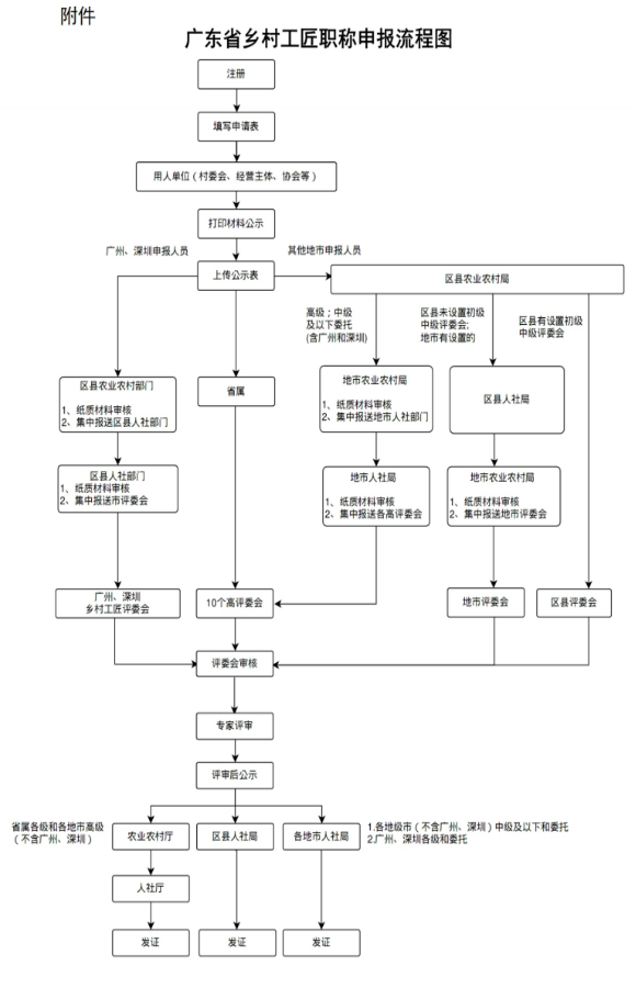 乡村工匠其他专业中级及以下职称评审可委托对应专业的广东省乡村工匠高级职称评审委员会进行评审,纸质材料经农业农村部门、人力资源和社会保障部门审核后报送相对应专业的广东省乡村工匠高级职称评审委员会。