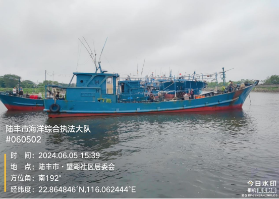 2024年6月5日,陆丰市海洋综合执法大队在陆丰市湖东对开海域查获一艘悬挂“汕濠广503(广)”标识的钢质船舶(编号扣02),总长21.4米,型宽3.5米,主机1部,主机铭牌不详,主机型号不详。