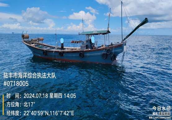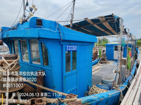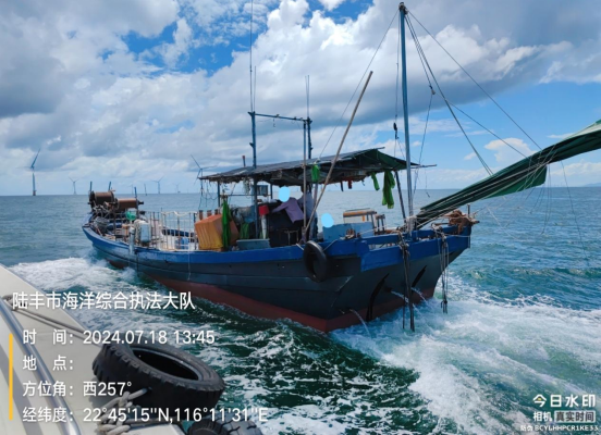 2024年8月12日,汕尾市海洋综合执法支队联合陆丰市海洋综合执法大队在甲东与神泉对开海域查获一艘悬挂“靖海镇涉渔临3020”牌号的玻璃钢船舶(编号扣15),总长16.9米,型宽3.61米,主机1部,主机铭牌不详,主机型号不详。