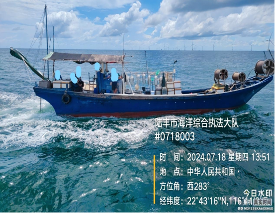 2024年7月18日,陆丰市海洋综合执法大队在陆丰市甲东对开海域查获一艘悬挂“神渔临1083”牌号的玻璃钢船舶(编号扣12),总长15.8米,型宽3.35米,主机2部,主机铭牌不详,主机型号不详。