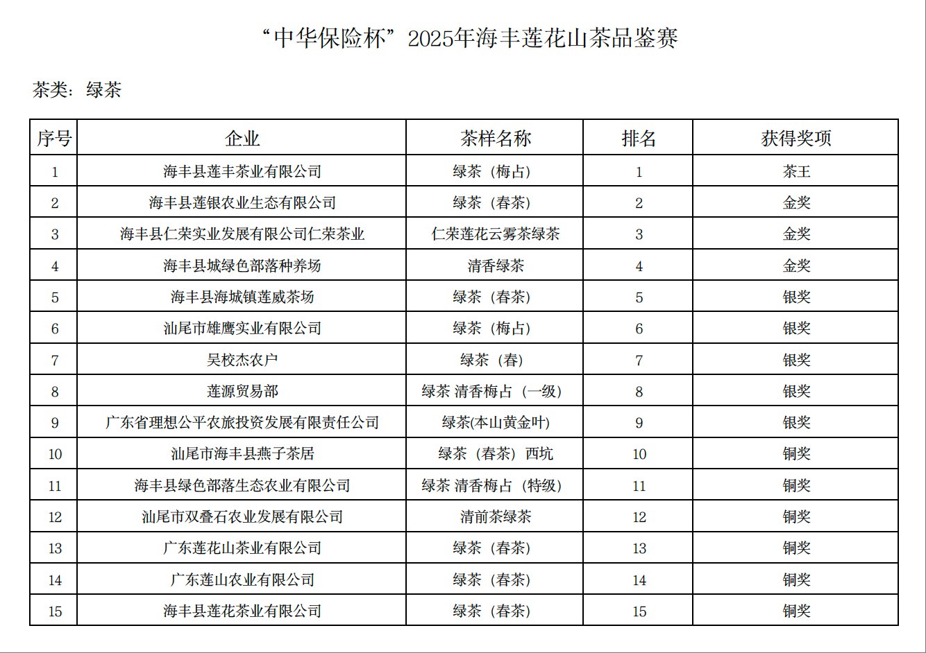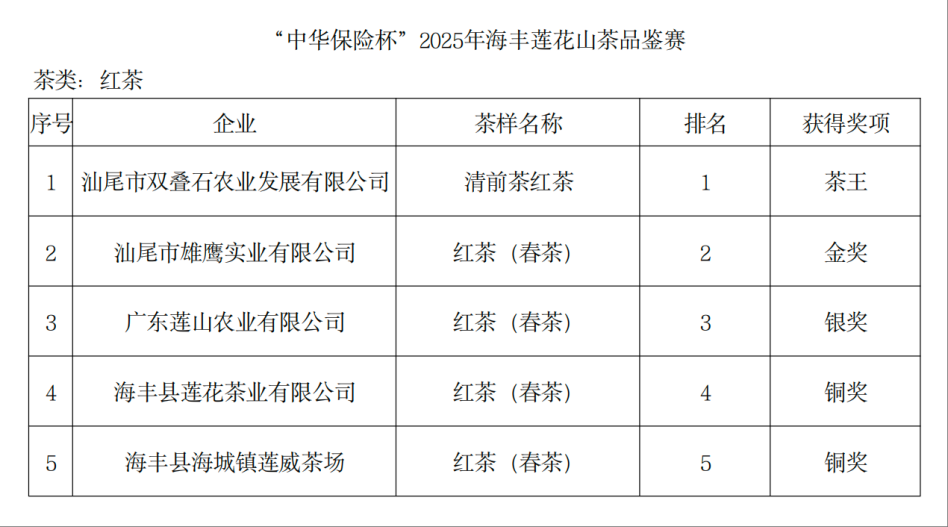 “让我们恭喜海丰县莲丰茶业有限公司、汕尾市双叠石农业发展有限公司,获得本次赛事的‘茶王奖’!”6月21日,2025海丰莲花山茶品鉴赛成功举行。此次赛事在绿茶品类中,共评选出1个“茶王奖”、3个“金奖”、5个“银奖”以及6个“铜奖”;在红茶品类中,共评选出1个“茶王奖”、1个“金奖”、1个“银奖”以及2个“铜奖”。