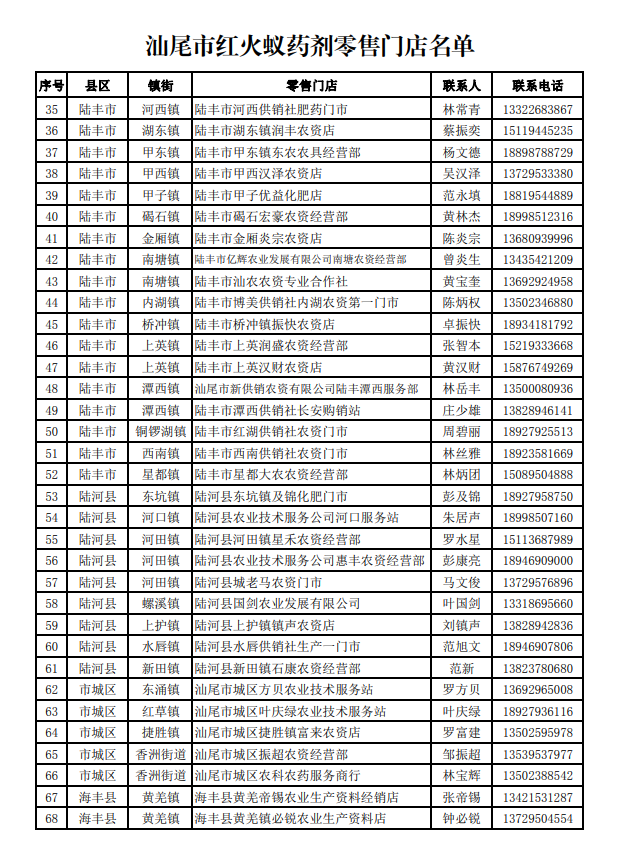 根据省农业农村厅办公室《关于做好全省红火蚁药剂零售门店布设工作的通知》要求,为充分发挥红火蚁联防联控群防群治合力,有效解决人民群众红火蚁药剂“买药难”的问题,经各县(市、区)农业农村部门推荐,市农业农村局审核,上报省农业农村厅备案,现将汕尾市海丰县城东供销社华源农资门市等68家农药经营门店确定为汕尾市红火蚁药剂零售门店,现予以公布(具体名单见附件)。