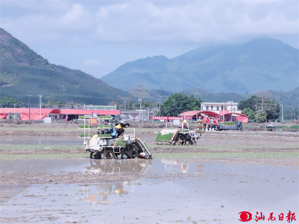 海丰县公平镇的春耕现场,插秧机在田间作业。