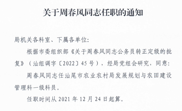 关于周春风同志任职的通知