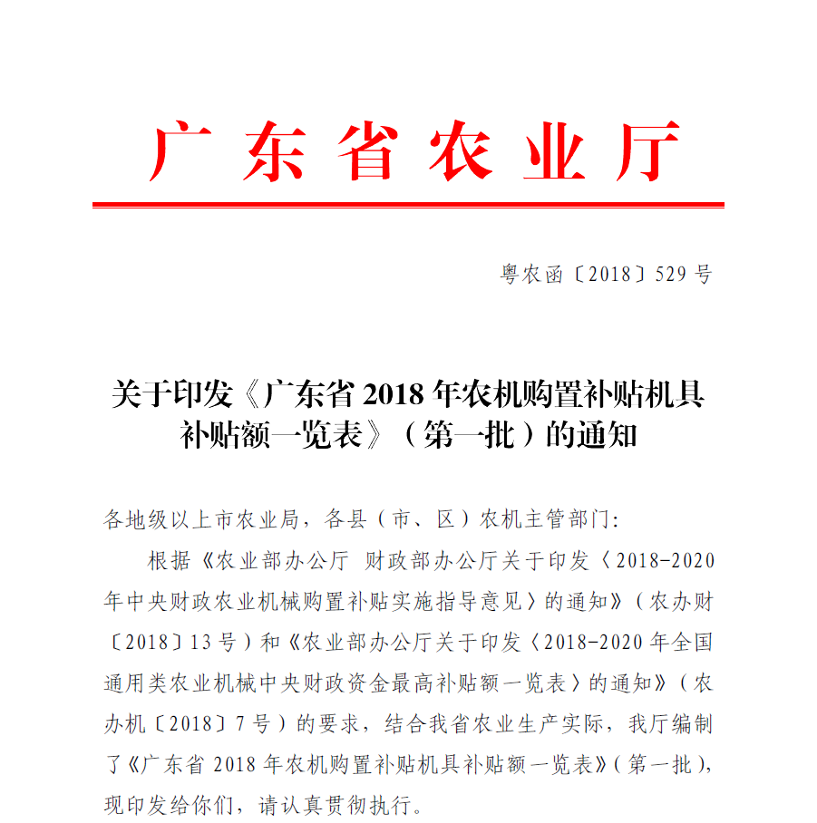 粤农函[2018]529号(关于印发《广东2018农机购置补贴机具补贴额一览表》(第一批)的通知)
