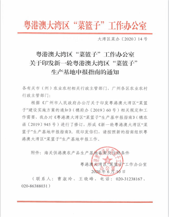 粤港澳大湾区“菜篮子“工作办公室关于印发新一轮粤港澳大湾区“菜篮子”生产基地申报指南的通知