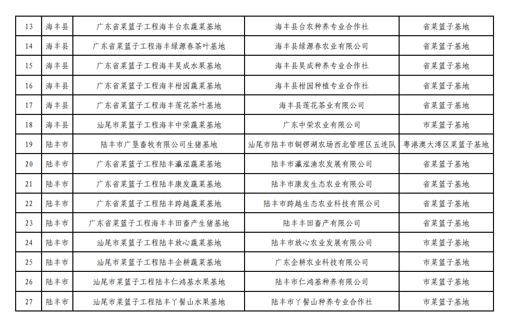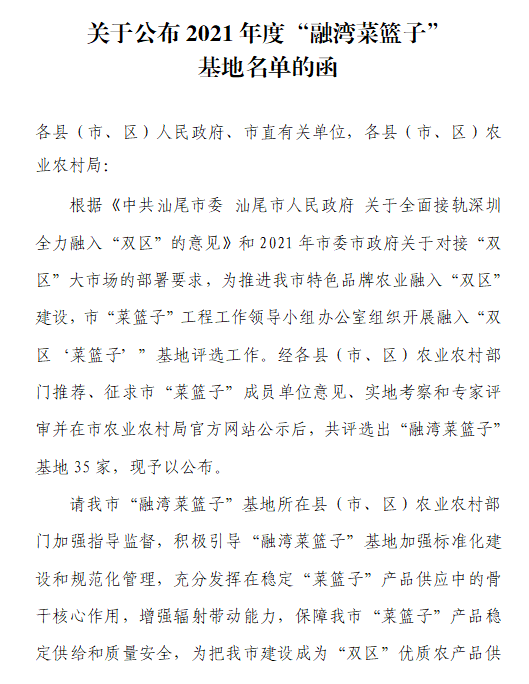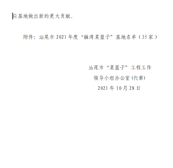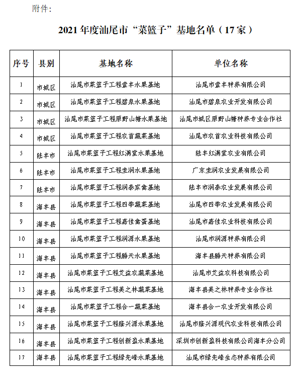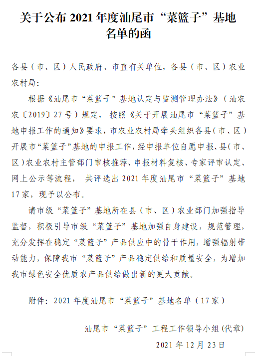 关于公布2021年度汕尾市“菜篮子”基地和“融湾菜篮子”基地名单的函