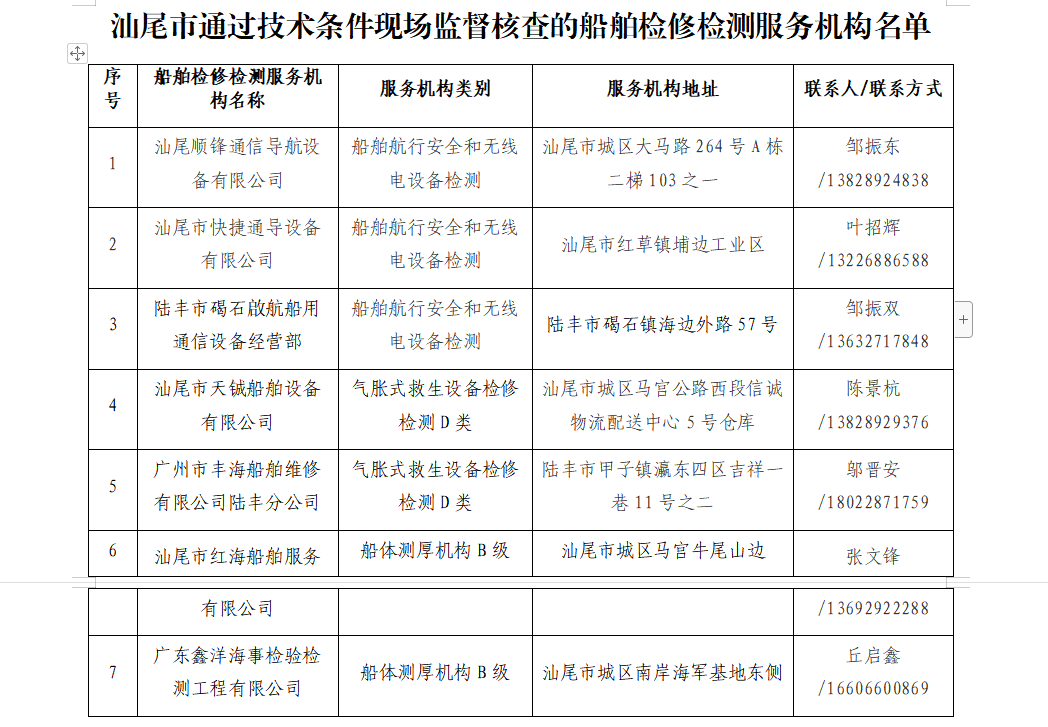 附件:汕尾市通过技术条件现场监督核查的船舶检修检测服务机构名单