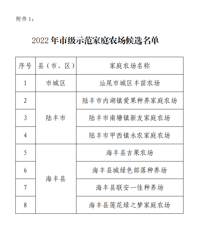 根据《关于开展2022年市级示范家庭农场认定和监测工作的通知》(汕农农办〔2022〕64号),经严格筛选,拟推荐汕尾市城区丰苗农场等8个家庭农场为市级示范家庭农场候选单位。海丰县穗丰园种养园等21家2020年市级示范家庭农场监测合格。现公开征求社会公众意见或建议,如有意见或建议,请于2022年9月9日前向我局反馈。