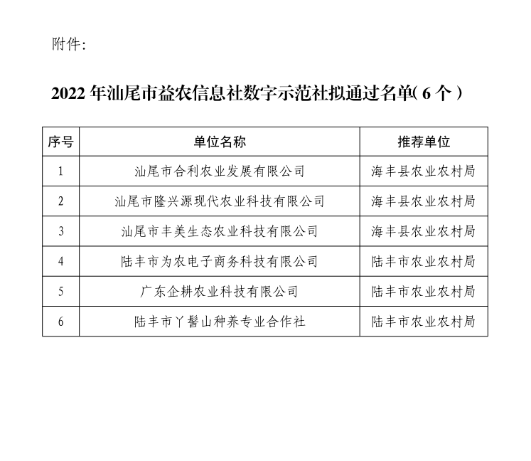 关于2022年汕尾市益农信息社数字示范社拟通过名单的公示