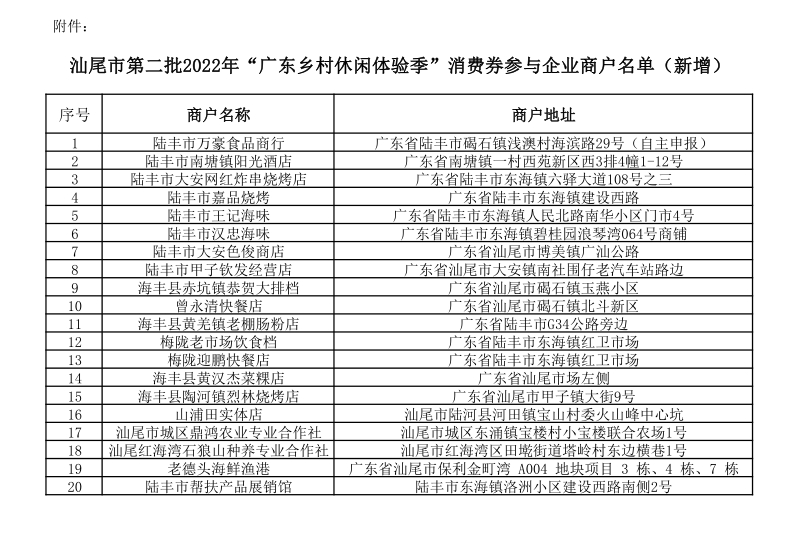 附件:汕尾市第二批2022年“广东乡村休闲体验季”消费券参与企业商户名单(新增)