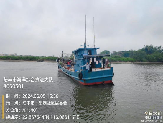 2024年6月5日,陆丰市海洋综合执法大队在陆丰市湖东对开海域查获一艘悬挂“汕濠广503(广)”标识的钢质船舶(编号扣02),总长21.4米,型宽3.5米,主机1部,主机铭牌不详,主机型号不详。