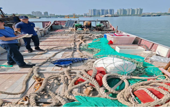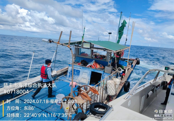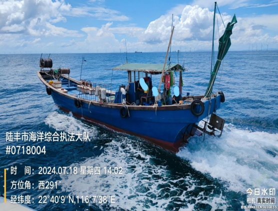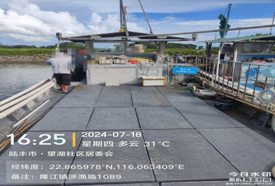 2024年7月18日,陆丰市海洋综合执法大队在陆丰市甲东对开海域查获1艘悬挂“隆江镇涉渔临1089”牌号玻璃钢船舶(编号扣10),总长16.7米,型宽3.9米,主机2部,主机铭牌不详,主机型号不详。