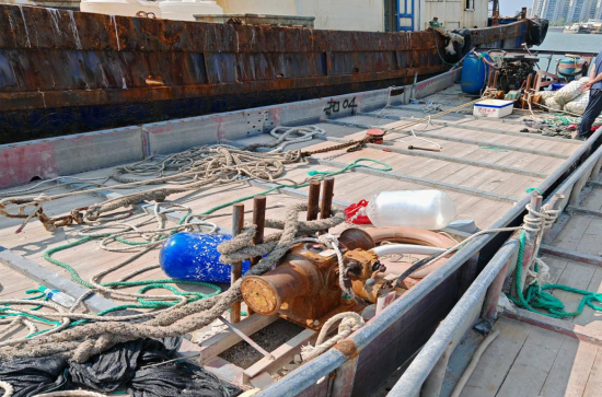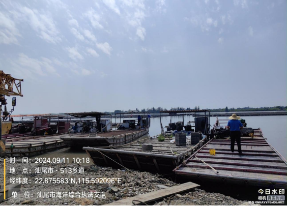 2024年8月16日,汕尾海洋综合执法支队在陆丰市乌坎镇漯河水域查获一艘无船名号标识的钢质船舶(编号扣05),总长10.9米,型宽3.65米,主机1部,主机铭牌不详,主机型号不详。