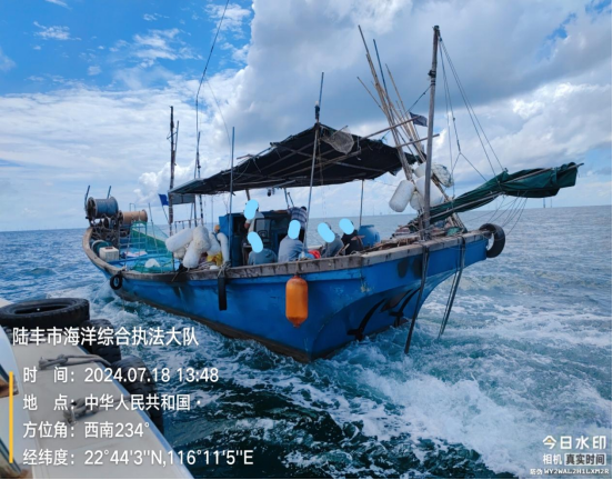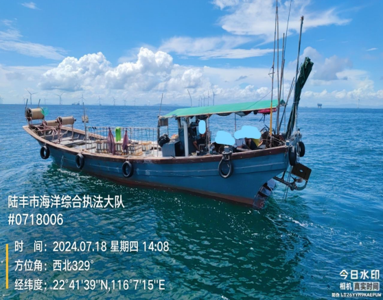2024年8月12日,汕尾市海洋综合执法支队联合陆丰市海洋综合执法大队在甲东与神泉对开海域查获一艘悬挂“靖海镇涉渔临3020”牌号的玻璃钢船舶(编号扣15),总长16.9米,型宽3.61米,主机1部,主机铭牌不详,主机型号不详。